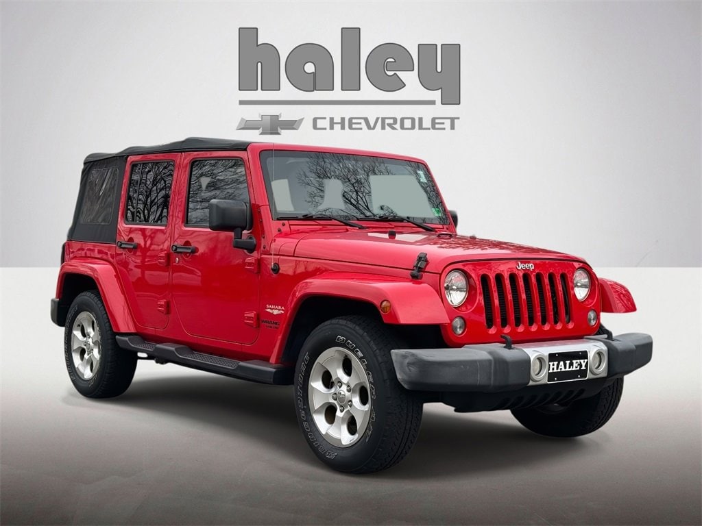 Recent Arrival! APPLY FOR FINANCING ONLINE, ONLINE APPRAISALS AVAILABLE, 18" x 7.5" Polished Satin Carbon Wheels, 3.21 Rear Axle Ratio, 4-Wheel Disc Brakes, 8 Speakers, ABS brakes, Air Conditioning, Alloy wheels, AM/FM radio, Audio Jack Input for Mobile Devices, Auto-dimming Rear-View mirror, Brake assist, CD player, Cloth Bucket Seats, Compass, Driver door bin, Driver vanity mirror, Dual front impact airbags, Electronic Stability Control, Front anti-roll bar, Front Bucket Seats, Front Center Armrest w/Storage, Front fog lights, Front reading lights, Fully automatic headlights, Heated door mirrors, Heated Front Seats, Heavy Duty Suspension w/Gas Shocks, Illuminated entry, Integrated roll-over protection, Leather steering wheel, Leather Wrapped Steering Wheel, Low tire pressure warning, Occupant sensing airbag, Outside temperature display, Panic alarm, Passenger door bin, Passenger vanity mirror, Power door mirrors, Power steering, Power windows, Quick Order Package 24G, Radio data system, Radio: Uconnect 130 AM/FM/CD/MP3, Rear anti-roll bar, Remote keyless entry, Remote Start System, Security system, Speed control, Split folding rear seat, Steering wheel mounted audio controls, Sunrider Soft Top, Tachometer, Tilt steering wheel, Traction control, Trip computer, Variably intermittent wipers.2015 Jeep Wrangler Unlimited Sahara Firecracker Red Clear Coat 4WD 3.6L V6 24V VVT 5-Speed AutomaticAll prices exclude taxes, title, $799 dealer processing fee and $319 theft protection etch. Prices are subject to change without notice. The dealer reserves the right to correct any errors or omissions. Offers, specials and discounts are vin specific. Although every reasonable effort has been made to ensure the accuracy of the information contained on this site, absolute accuracy cannot be guaranteed.